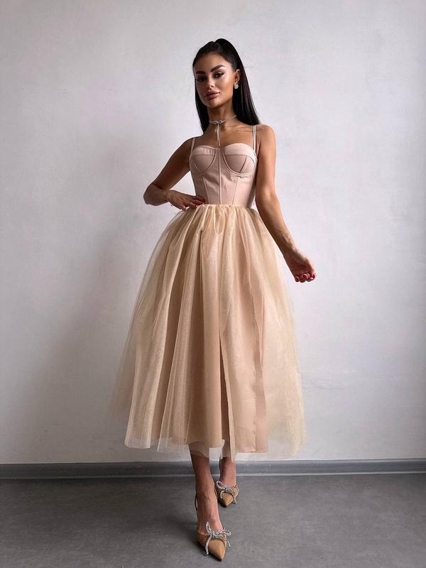 Сукня міді із чашками з пишною фатиновою спідницею, плаття міді на брителях