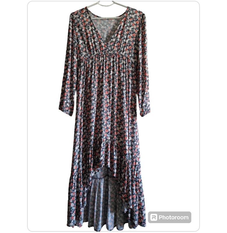 Платье с цветочным принтом из 100% вискозы. На размер M-L. В идеальном состоянии. Замеры: Плечи 45 Рукав 60 Подмышками 49 Длина по спинке 137 Длина спереди 96 Отправлю безопасной доставкой, или наложенным по подписке за пересылку