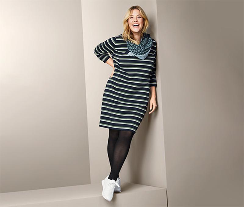Удобная и универсальная вещь для современного женского гардероба Цвет Темно-сине-шалли-белая полоска Материал 62% хлопок (из органического земледелия), 33% полиэстер, 5% эластан 40/42 евро ПОГ: 52 см +++ ПОТ: 50 см Полуобхват бедер: 55 см Длина: 93 см Длина рукава: 45 см Это совершенно новая одежда!