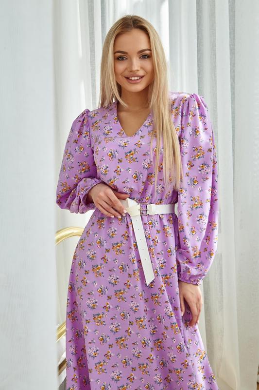 Платье женское, миди, без пояса, весеннее, летнее, с длинными рукавами, сиреневое в цветоч...