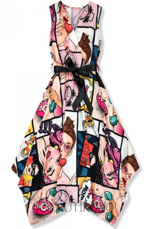 Цветное платье миди комикс принт Размер S-M Без пояса Декольте немножко скрепленное нитью Описание продукта - цветное длинное платье с принтом - асимметричный крой - без рукавов - резинка на талии - без кишень - непрозора - легкий, тонкий материал - материал: 95% полиэстер, 5% эластан