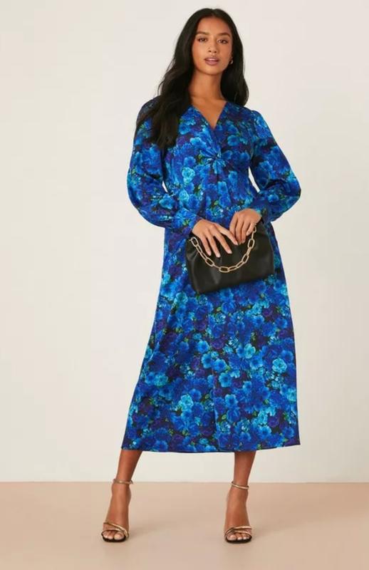 Миниатюрное синее платье-миди с закрученным передом и цветочным принтом. Длина: прибл. 124 см. Подходит: подходит и расширяется. Подходит для: выхода в свет. длина-115 см, ширина по плечам-32 см, длина рукава-56 см, полуобхват груди-45 см, талия-37 см тянется до 44 см, бедро-59 см, подкладки нет,ткань не тянется