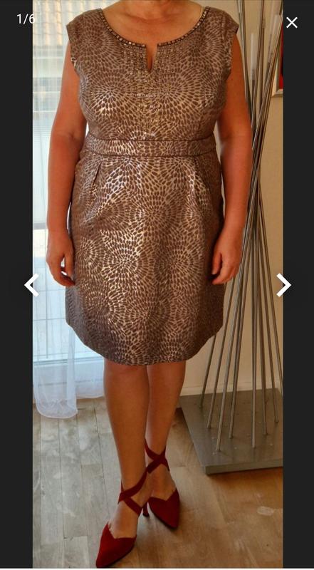 Платье праздничное по фигуре, застежка на молнию сзади, ткань 55%-коттон,36%-полиэстер,9%-люрекс нить,блеск серебро, подкладка 100% шелк Новое без бумажной бирки, безложений Размер указан 18 Замеры на фото, не тянется