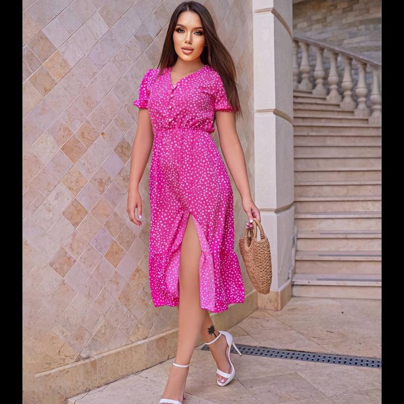 Платье миди в горошек розовое зелёное чёрное с v образным вырезом с короткими рукавами при...