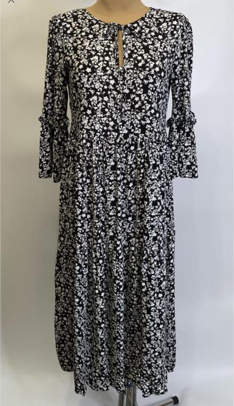 Чорно-біла сукня Sora в квітковий принт.Модель вільного крою виконана з візерункової тканини. - Круглий виріз із завʼязками по переду - Розкльошений фасон. - Рукав укорочений з рюшею - Візерункова тканина. Склад: 100% Віскоза Стильна сукня-міді в квітковий принт з воланами/рюшами по низу і рукавам,талії відрізна,стан відмінний,без нюансів і дефектів,вказаний 8/34р,орієнтовано підійде на 46/48р порівнюйте з вимірами👇👇👇 По плечам 36 см По грудях 47-49 см(під пахвами) По талії 44-45 см По стегнам 70 см Довжина по спинці від плеча 128 см(до талії 40 см) Рукав 48 см,ширина по біцепсу 18 см Арт 3382.43