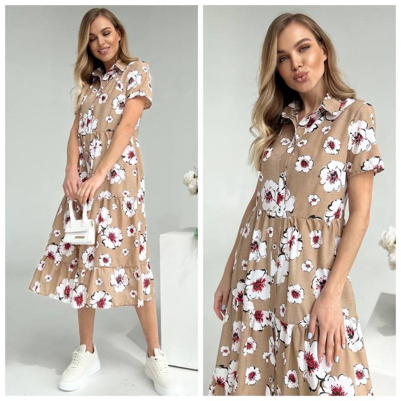 Летнее женское платье в миди в цветочный принт ярусами. Элегантный дизайн с короткими рукавами и воротником, застегивающимся на пуговицы, добавляет женственности. Изготовлено из комфортного льняного хлопка, идеально подходит для летних прогулок и отдыха. Платье имеет боковые карманы . Ткань Лен - хлопок Размеры: 42,44,46,48