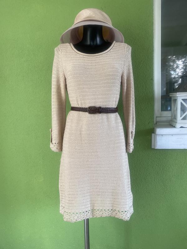 Стильное в'заимное платье от Massimo Dutti. Цвет бежевый, длинный рукав, отделка-кружево. На трикотажной подкладке. Размер по набору-L. Замеры:длина-92 см, ПОГ-43 см, ПОТ-39 см, ПОБ-46 см, рукав-55 см.