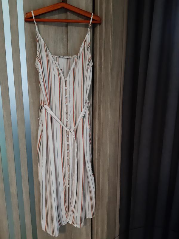 Платье из вискозы в полоску с послевкусием. Пуговицы функциональные, обтянутые тканью. Бретели регулируются. Очень легкое, приятное на жаркое лето. Размер 12. длина 105-110 см (за колено). ПОП - 50 см
