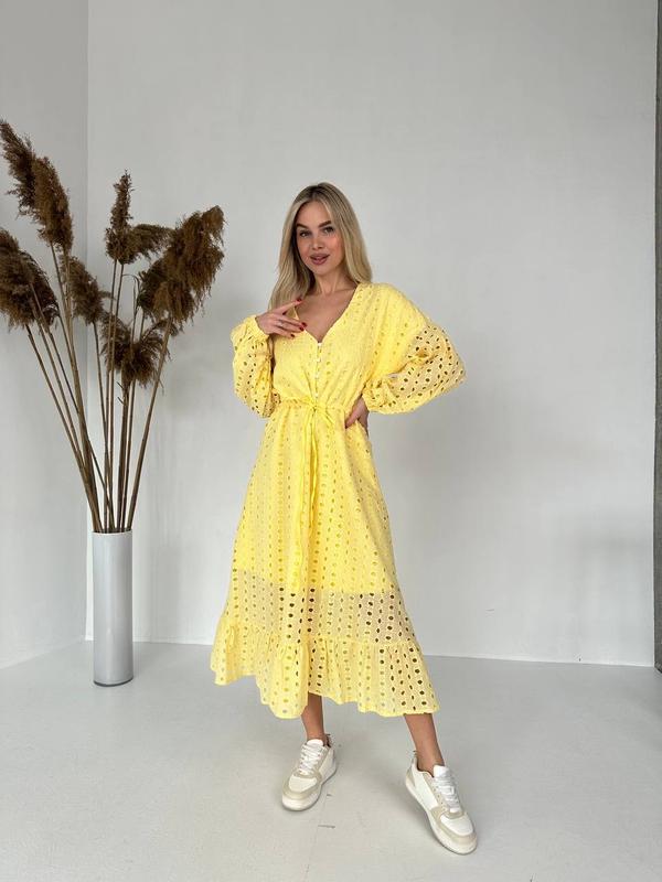 Сукня 2932/1 Тканина бавовна, прошва. Розмір 42-46, 48-52 Довжина 122см Обхват грудей у розмірі 42-46 100см, талія на кулісці 85см. По стегнам спідниця розклешена 130см Розмір 48-52 Обхват грудей 130 Талія 105 Стегна 135см Ціна 1400грн