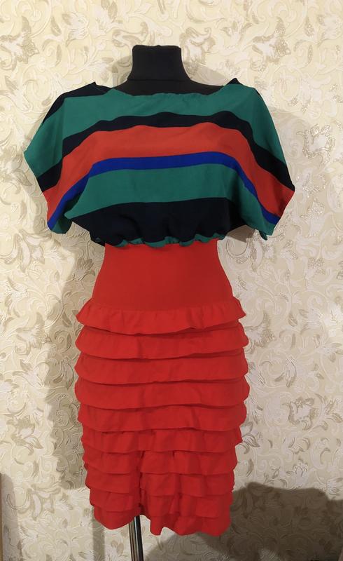 Сукня яскрава Нижня частина з трикотажу, дуже добре тягнеться; верхня частина не тягнеться Стан: б/в задовільний Розмір: S/M (заміри уточнюйте) Тканина: склад вказаний на фото Колір: різнокольоровий