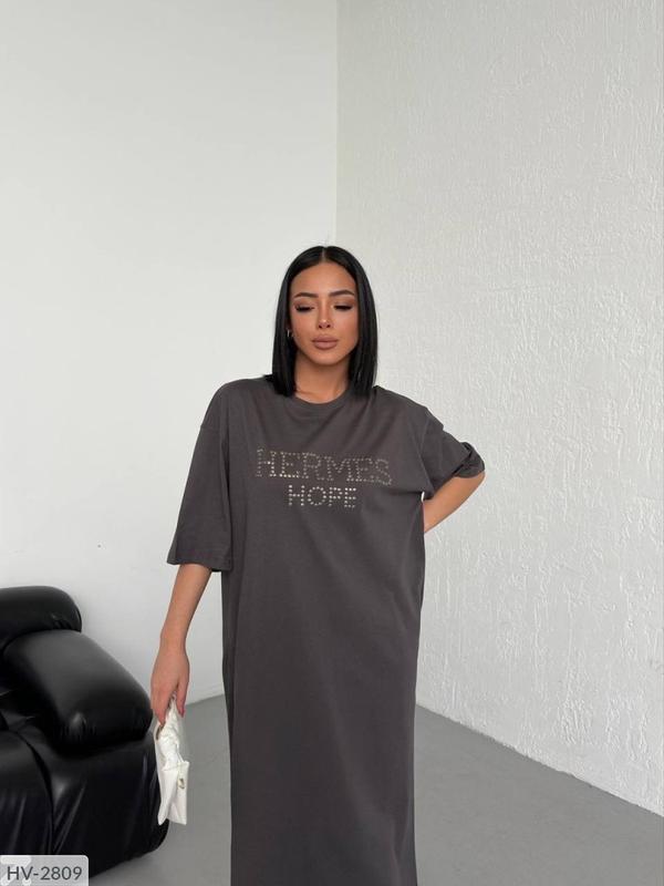 Сукня HV-2809 Розмiри: S, M, L Виробник Туреччина Стильне плаття футболка подовжена, збоку розрізи, край знизу необроблений Дуже приємна до тіла, напис плоскі металеві елементи Замір: S Ніг-58 см Довжина -120 см M Ніг-60 см Довжина -122 см L Ніг-62 см Довжина -124 см Кольори: чорний, малина, графіт Похибка вимірювання + 1см