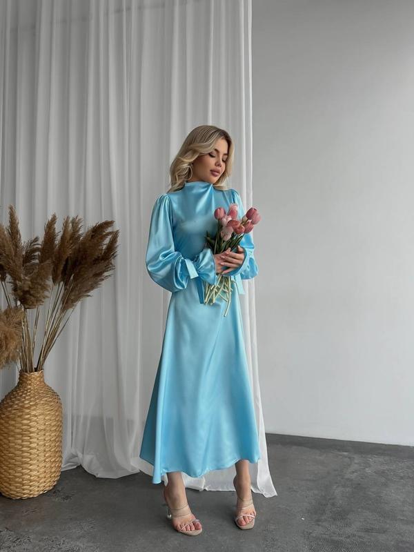 •Размеры:42-44, 44-46 •Материал: шовк Армани • Цвета: изумруд, зеленый, голубой, черный Мод:1041 то-Одеса Платье сшито из шелка, имеет актуальную длину меди.красные длинные рукава с завязками, и акцентную завязку на талии