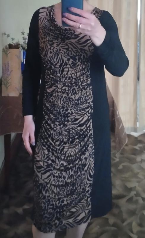 Платье в идеальном состоянии, на подкладке размера 48-50. Очень красивого у оригинального кроя. Замеры: Пог - 50 см, тянется до 56 см, Пот - 47 см, тянется до 55 см, Поб - 53 см, тянется до 62 см, рукав - 59 см, плечи - 40 см, длина платья - 105 см. За счет эластана, очень хорошо тянется.