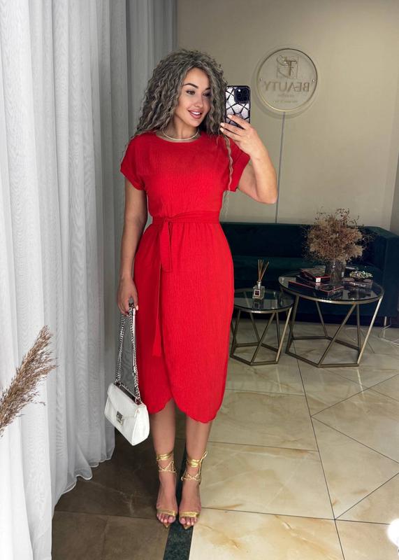 Платье Размеры: 42-44,46-48,50-52,52-54 Тканина: креп жатка Турция! Цвета: бежевый,Голубой,Черный,Красный,зеленый Актуальные Оттенки🤩 Поясок идет в комплекте! Цена 510 гр
