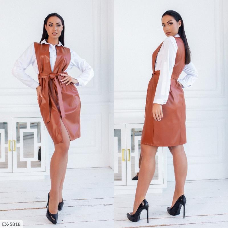 Платье EX-5818 мод: 256 Розмiри: 48-50, 52-54, 56-58 Стильный сарафан из экокожи Ткань: экокожа Цвета: терракота, чёрный, шоколад Длина батал (48-50, 52-54, 56-58) : *сарафана 101 см. *рост модели 178 см.