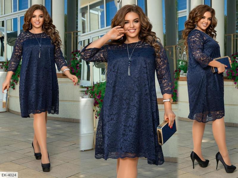 Сукня EK-4024 1237 Розмiри: 62-64 Колір: синій, зелений, фуксія, Електрик. Тканина про-во Туреччини: дорогий Гіпюр на трикотажному підкладі. Довжина сукні 100 см. Довжина рукава 45 см.