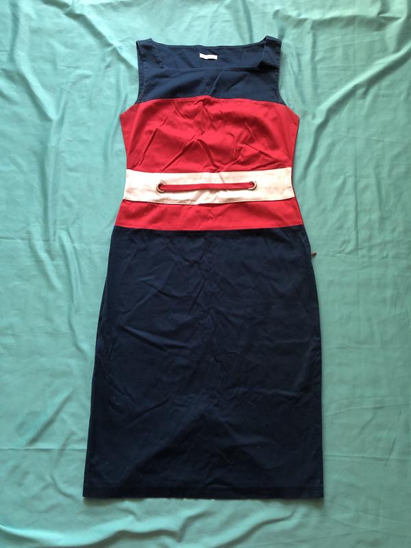Платье-миди Сбоку потайная молния; сзади внизу небольшой разрез Состояние: удовлетворительный Размер: S Тканина: 97% бавовна; 3% еластан Цвет: синий; красный; белый