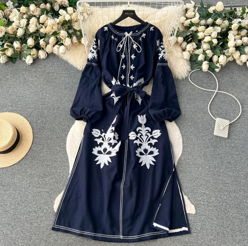 Гарна бавовняна сукня з вишивкою, об'ємний рукавчик, довжина міді, якісний матеріал, тримає форму, по боках розрізи, в талії фіксується пояском, сідає вільно • Розмір універсальний, підходить на розмір S-M-L • Довжина 128 см півобхват грудей 54 см довжина рукав від горловини 69 см півобхват пояса 55 см (фіксується пояском) півобхват бедр 60 см Колір:синій