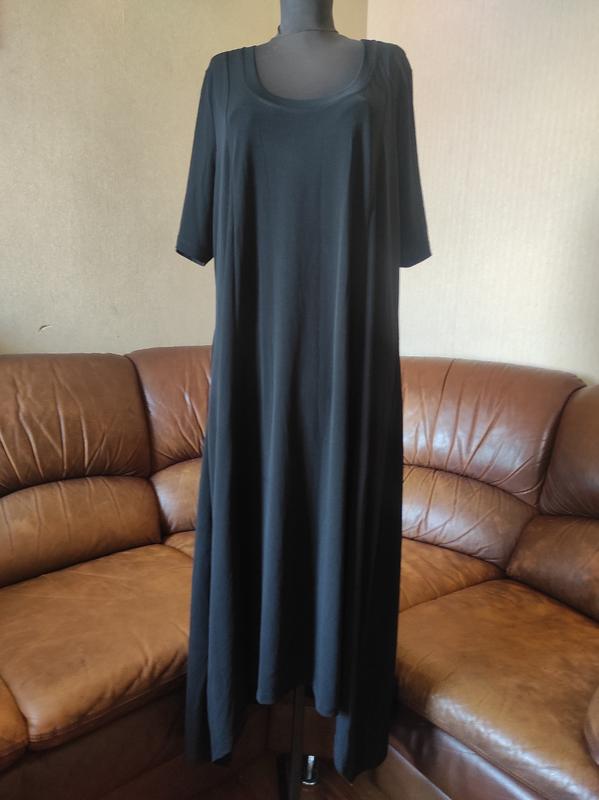Платье миди, сзади немного длиннее, чем впереди. Ткань тонкая, эластичная, хорошо тянется. Цвет насыщенный черный. Размер 48/50, подойдет от L до XXL, ориентируйтесь на замеры Пл 38-39 Ног 56, тянется Нот 54/55, тянется Длж 123/ 112 Рукав 28
