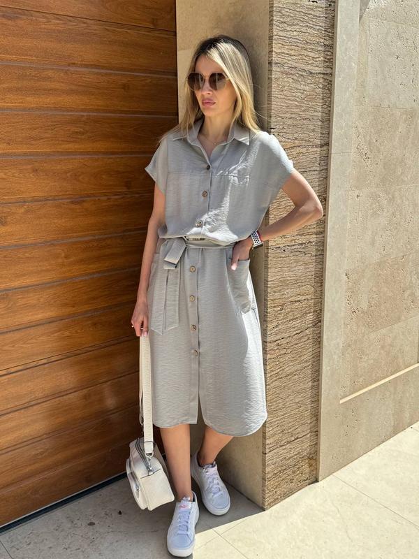 Сукня Мод. 0362 Тканина: еко льон жатка Розмір: 42-44, 46-48, 50-52 Колір: пудра, рожевий, трава, сірий, бежевий, блакитний, оливка Ціна: 930 грн Елегантна сукня вільного крою з бічними накладними кишенями та застібкою на ґудзики - ідеальний вибір для комфортного та стильного повсякденного носіння. Рукав суцільнокроєний, короткий, зі спущеною лінією плеча, що забезпечує зручну посадку, пояс з'ємний, фіксується шльовками в бокових швах, підкреслює жіночність та витонченість образу Є заміри Є відео огляд