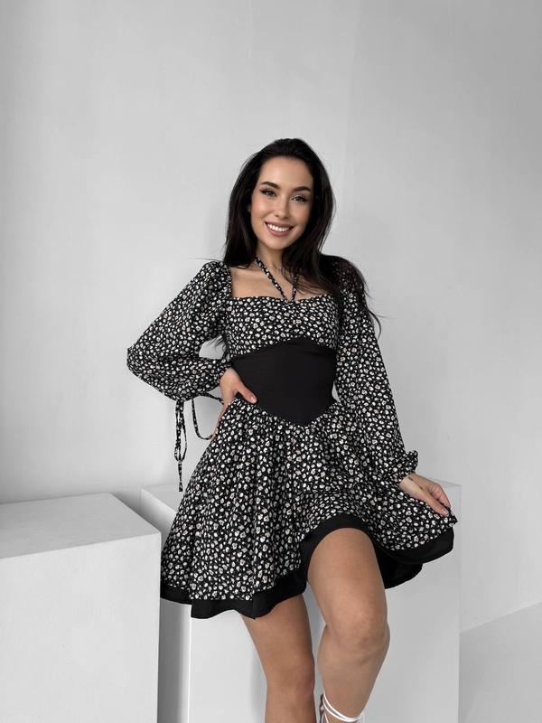 Платье Софи (Фотто приема) ▫️Мод: tr 0651 ▫️Ткань: Турецкий софт ▫️Цвета: черный, красный,голубой ▫️Размеры: 42/44 46/48 Очаровательное, цветочное платье софи с длинным регулируемым рукавом, корсетным поясом, лямочкой для декольте и пышной асимметричной двухслойной юбочкой мини🥵 Идеально с косухами, жакетами, как с грубыми ботинками так и с каблуками🔥 Создавай неповторимые образы с нами ❤️
