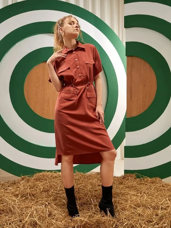 Сукня Shein Размер - L Цвет - терракотовый, в жизни точно такой как на оригинальных фото с сайта Состав : 90% лиоцелл + 10% лён Состав шикарный, тонкая, не просвечивается, очень приятная к телу Модель очень не обычная, талия на кулиске, карманы на замке. Выглядит на модель "Сафари" Также можно как спортивный стиль, спереди немного короче, чем сзади Реальные замеры: ПО груди - 49см летуча мишь модель ПО талии - 52 см, можно затянуть ПО стегна - 64 см Длина по переду - 109 см Длина по спинке - 120 см Рукав от шейи - 37 см