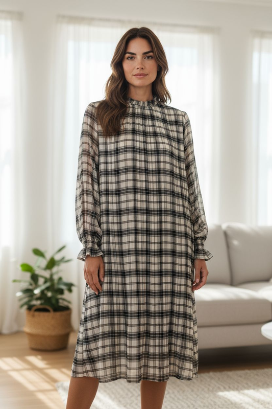 Шифоновое плиссированное платье с рукавом Primark клетка р. 14 (р. L/XL) Длинный шифоновый прозрачный рукав (манжет резинка), внутри короткая эластичная подкладка. Платье новое с бирками. Замеры по запросу.