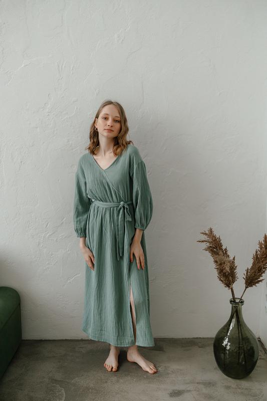 Платье миди из муслина с рукавом оливковое зеленоеное муслиновое платье платье