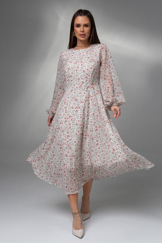 14621_мультиколор Цветочное платье из шифона с нижней текстильной подкладкой и длинными рукавами-фонариками на резинках. Модель приталенного кроя с застежкой-гудзиком по горловине и боковой молнией. Платье с юбкой миди длины.