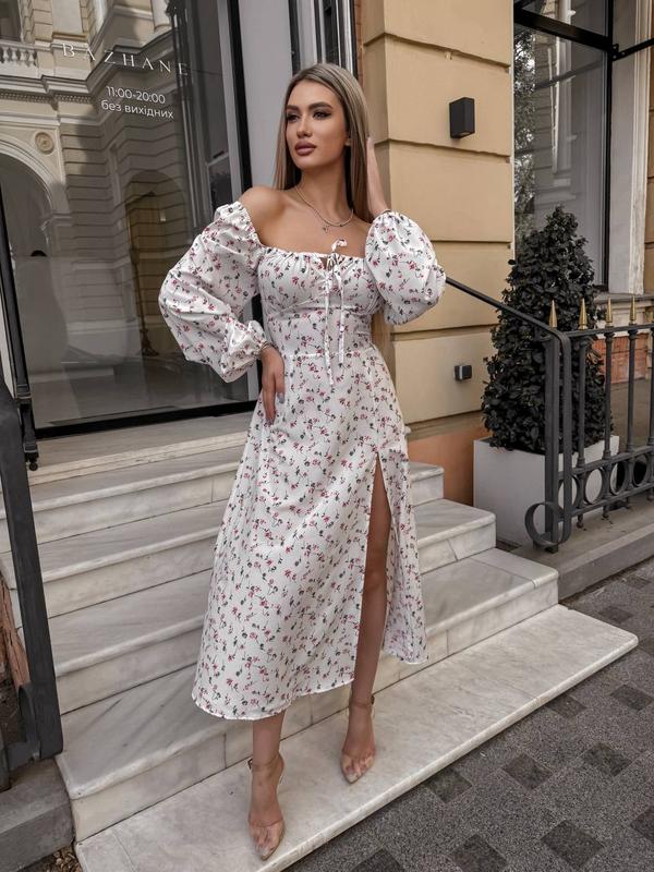 Нежное и очень легкое летнее платье комку на затяжке спинка затягивается на шнуровке, рукав длинный на резинке, на юбке с разрезом Тнань: шелковый софт, принтованный Коляры: белый (розовый цветок), белый ( розовый цветок)белый (малиновый цветок), белый (черный цветок) Размеры: с-м; м-л Цена: 625 грн