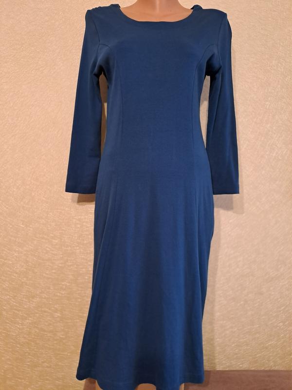 Платье из плотного качественного трикотажа очень приятное на ощупь. Темно бирюзовый цвета. Расклешенное к низу. Есть 2 внутренних боковых кармана. Состояние: новое(без бумажной этикетки). Состав: 100% качественный хлопок. Производство: Индия. Размер: S. Замеры. Плечи: 39 см. Грудь: 47 см(от подмышки до подмышки). Талия: 41 см. Бедра: 51 см. Длина рукава: 50 см. Длина изделия: 110 см.