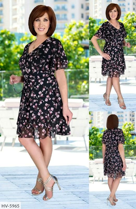 Сукня HV-5965 мод. 645 Розмiри: 50, 52, 54, 56 Тканина: турецький шифон, підкладка софт, декольте на гудзиках, пояс на куліске Довжина: 98 Р. 50, О. грудей 100 О. Стегон 110 Р. 52, о. грудей 104 О. Стегон 114 Р. 54, о. грудей 108 О. Стегон 118 Р. 56, о. грудей 112 О. Стегон 122