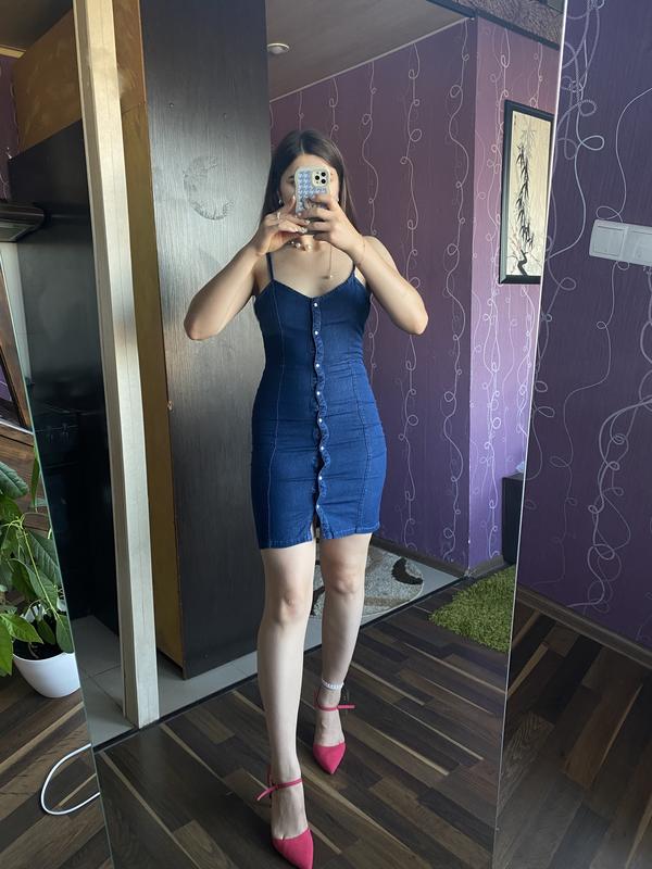 Сукня джинсова на застібках , лямки регулюються, тканина тягнеться Мої параметри 89/71/100 164 На бедра 95-97 буде ідеально