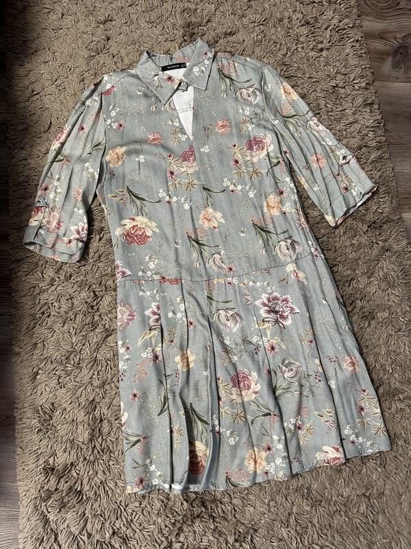 Платье свободного кроя, вискоза, красиво сделано вверху. Серо-голубой цвет в цветы. Состояние нового, один раз одето. Размер S.