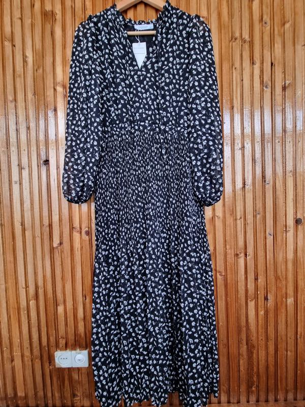 Шифоновое плиссированное платье миди Reserved. Размер по бирке 36. Платье на подкладке, рукава без подкладки. Горловина на завязках. Широкие рукава сверху присборены. Верхняя часть платья - гладкий шифон, юбка от талии в мелкую плиссировку, книзу плиссировки крупнее. Размер 36: ПОГ 47 см ПОТ 34-48 см, на резинке, хорошо тянется. ПОС по подкладке 60 см Длина 126 см Рукав 60 см Состав: 100% полиэстер. Смотрите, пожалуйста, все мое объявления — большой выбор платьев и блуз H&M, Zara, Mango, Asos, Reserved разных размеров;) Подписывайтесь на мою страницу, частое пополнение ассортимента)