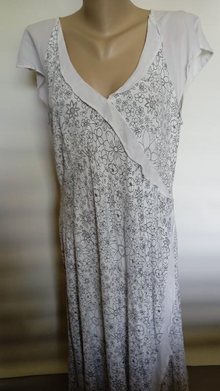 красивое,вискоза100%, очень нежный рисунок ткани, очаровательная отделка белой тканью, длина108см, пог60 в спокойном состоянии тянется больше, полуобхват пояс50-56,,беддра65-66 и тянется70-72см, качество бренда