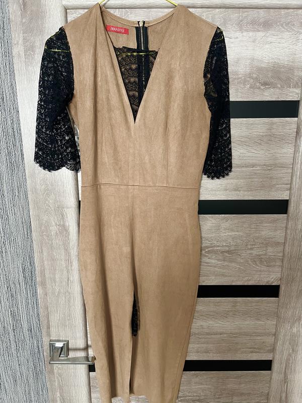 Платье длины миди из замши с гепюровыми вставками. Идеально подчеркивает фигуру. Стан идеален без дефектов.
