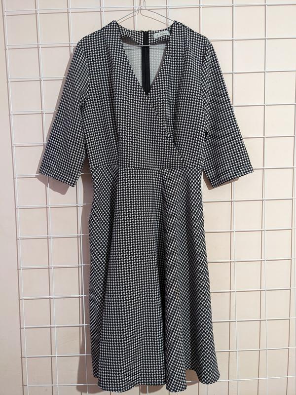 Плаття на запах, застібується замочком Матеріал - креп костюмка Колір - Чорний, білий (гусяча лапка) Розмір - L Стан - 9/10