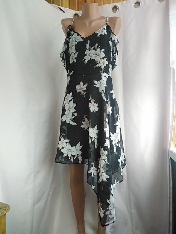 Шифоновое платье на подкладке. В цветочный принт. Юбка с хвостами. Сзади потайной замочек. Брители регулируются