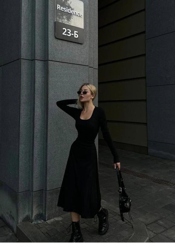 тканина: мустанг цвет: черный Платье новое, заказавшее не подойти размер На об' ем грудей: 85-95 см На талию до 80 см На стегна до 100 см Длина рукава: 67 см Длина платья: 114 см На спинке шнуровка благодаря почему можно регулировать размер