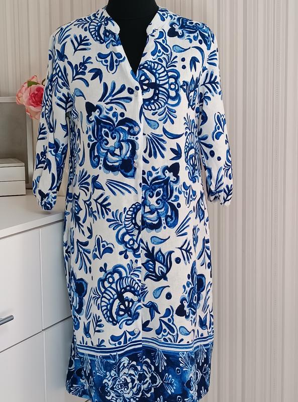Платье рубашка, бело синего цвета. Застегивается до самого низа на пуговицы. Можно носить под поясок. Очень красиво сидит по фигуре. Состояние идеал, следов ношения не видно Размер:S. Состав: 55% льна, 45% вискозы. Длина 98 Длина рукава 41 Плечи 43- 44 ПОГ 49 ПОТ 51 ПОБ 55