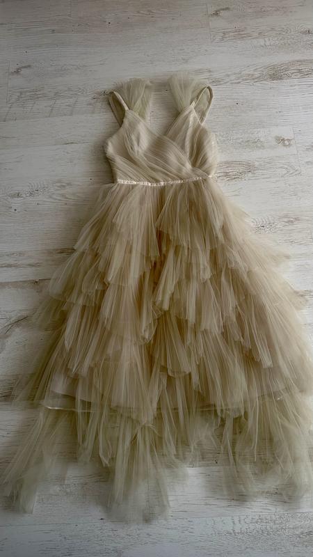 Фиксированный лиф с запахом спереди • Многослойная плиссированная юбка из тюля с лепестками • Ленточный пояс • Рукава со сборками и открытыми плечами • Длина миди • Потайная застежка-молния сзади Состав: Верх - 100 % хлопок, подкладка - 100 % полиэстер.