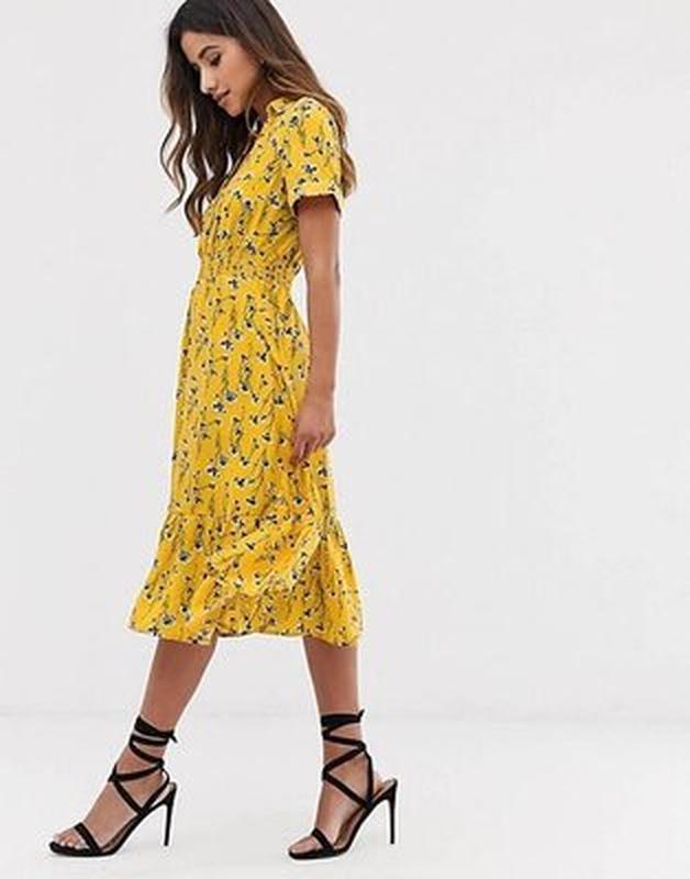 Красивое жёлтое платье с цветочным принтом без подкладки. Пояс на широкой резинке, воротничок с отворотом. Цветы, не требующие ухода Сплошной принт V-образный вырез Планка на пуговицах Пояс‑резинка Отвороты Оборка по нижнему краю Платье хорошо смотрится как с каблуками, так и с кроссовками! Запасная пуговка в наличии. Состав 100% полиэстер Размер указан EUR/L ПОГ - 50 - 51 см Рукав - 22 см Плечи - 41 см ПОТ -34- 45 см Бедра свободно Длина по центру спинки - 118 см Состояние новой вещи.