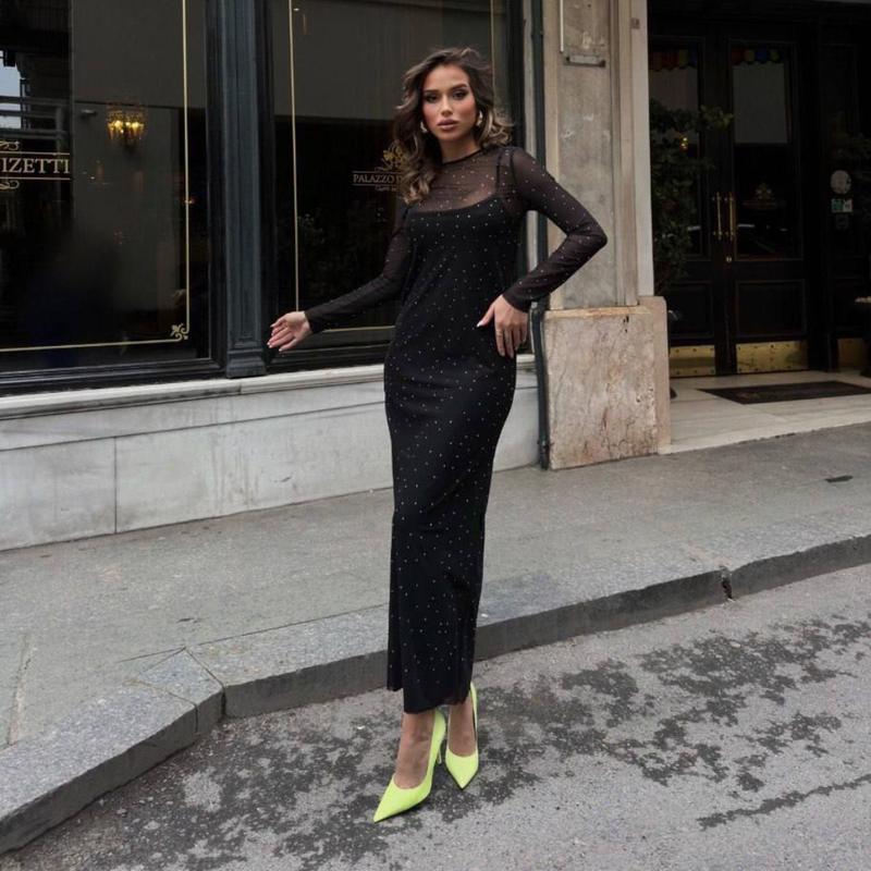 Платье в длине макси выполнено из сетчатого материала. Мерцающий декор особенно эффектно смотрится при движении. Приталенный силуэт подчеркивает изгибы фигуры. • Размер s m l xl • Длина сетка 133 см • длина нижний слой 106 см 2642