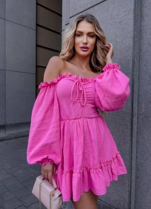 Сукня арт. mag. 10309 Очень нежная и романтичная, с длинным рукавом фонарик на резинке, талия на резинке, спинка просроченная, по низу оборка Ткань: качественный натуральный "Муслин" Состав: 100% хлопок Цвет: белый, черный, розовый, голубой, барби, желтый Размеры: С-М М-Л Цена 870 грн
