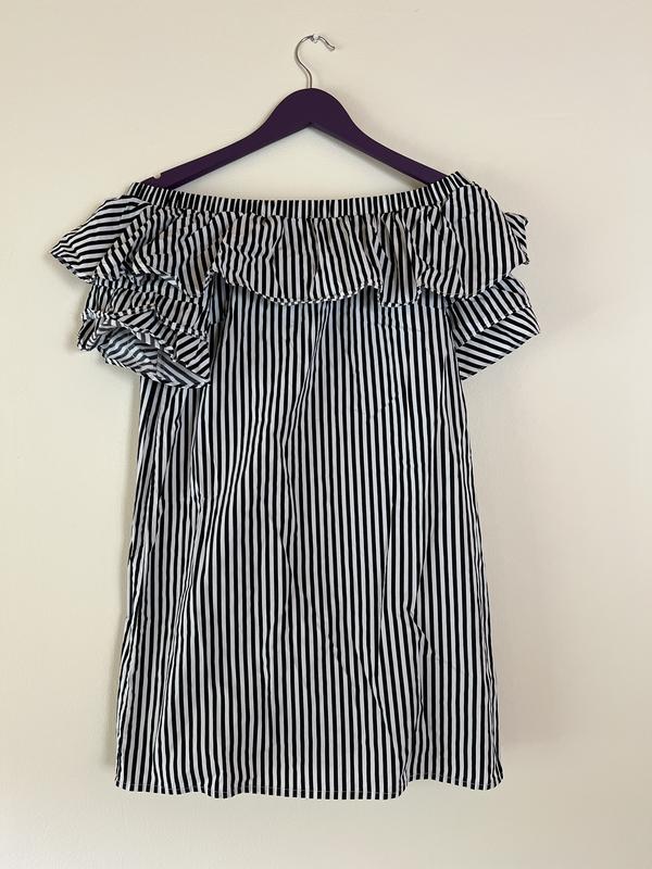 Плаття бюстье смугасте, є короткі рукава - можна носити як з спущеними плечима, так і у форматі футболки. 100% котон, довжина до коліна. Розмір S-M, сідає на плечах, нижче вільне - оверсайз.