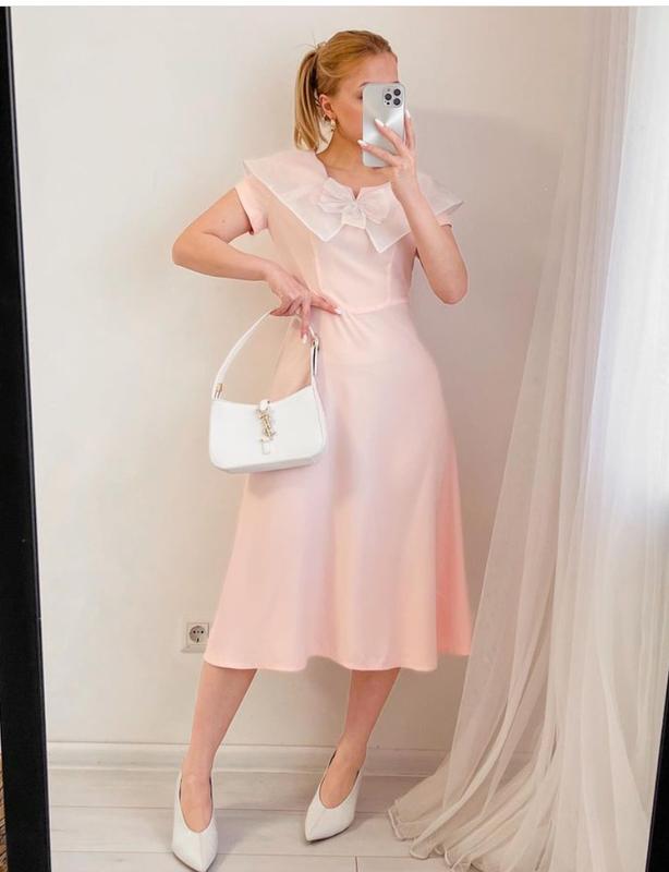 пудровое платье с воротничком из органзы размер 36 (S) полиэстр полуобхват: груди-46см талия-36см стегна-50см Длина платья-118см