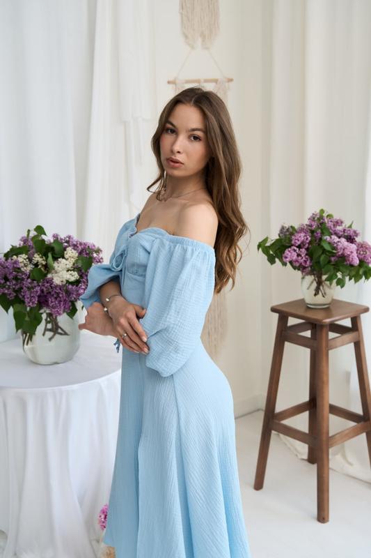 Платье длины миди, выполненное из натуральной ткани - муслин. Состав ткани 100% хлопок. Ткань, мягкая, приятная на ощупь, обладает хорошими гигиеническими свойствами, что делает ее идеальной для летнего сезона. Платье имеет акцентную талию, которая подчеркивает фигуру, широкие рукава до локтя на резинке, декольте регулируется шнурком, юбка в бёдрах свободна спереди имеет разрез на левой стороне, сзади предусмотрена скрытая молния Цвета: Светло-голубой Черный 🏷️ Цена- 990 грн ▪️Размеры: XS, S, M, L Отправка 1-5 роб. дня! Подчеркните свою романтичность и красоту, заказывайте 💌