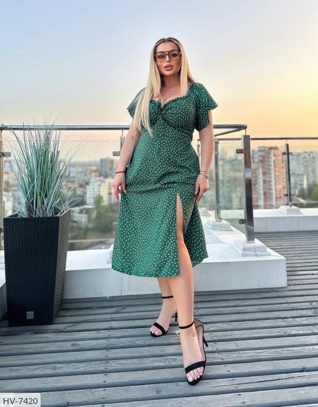 Сукня HV-7420 арт 5810 Розмiри: 48-52, 54-58, 60-64 Матеріал: софт-шовк (у складі віскоза, мало мнеться, легка тканина) Плаття можна моделювати: мотузочки, розташовані в районі грудей, можна зав'язати бантиком - не буде декольте або зробити виріз декольте більш глибоким. Ззаду шнурівка-регулює приталеність. Довжина 74 см від талії. Вимірювання: 48-52: ОГ 98-106, ОТ 75-95, ОБ 104-120 54-58: ОГ 108-118, ОТ 80-110, ОБ 118-128 60-64: ОГ 120-130, ОТ 88-130, ОБ 130-145