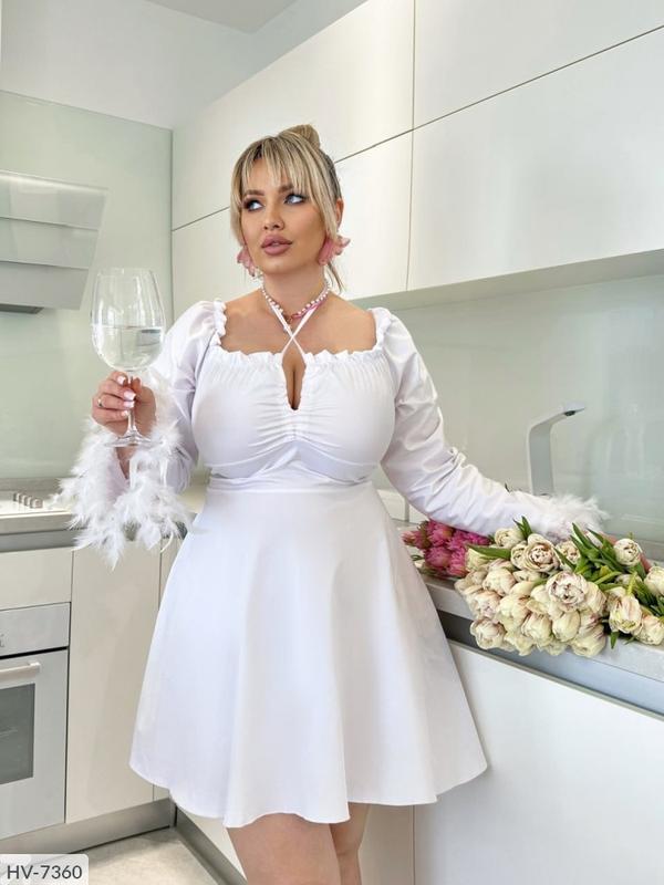 Сукня HV-7360 арт 5535,1/1 Розмiри: 42-46 Матеріал: костюмна тканина на коттоновой основі. Сукню можна моделювати: мотузочки, розташовані в районі грудей, можна зав'язати бантиком або на шиї. Ззаду шнурівка регулює приталеність. Замір: 42-46: довжина виробу 84 см. ОГ 80-96 см, ОТ 56-82 см